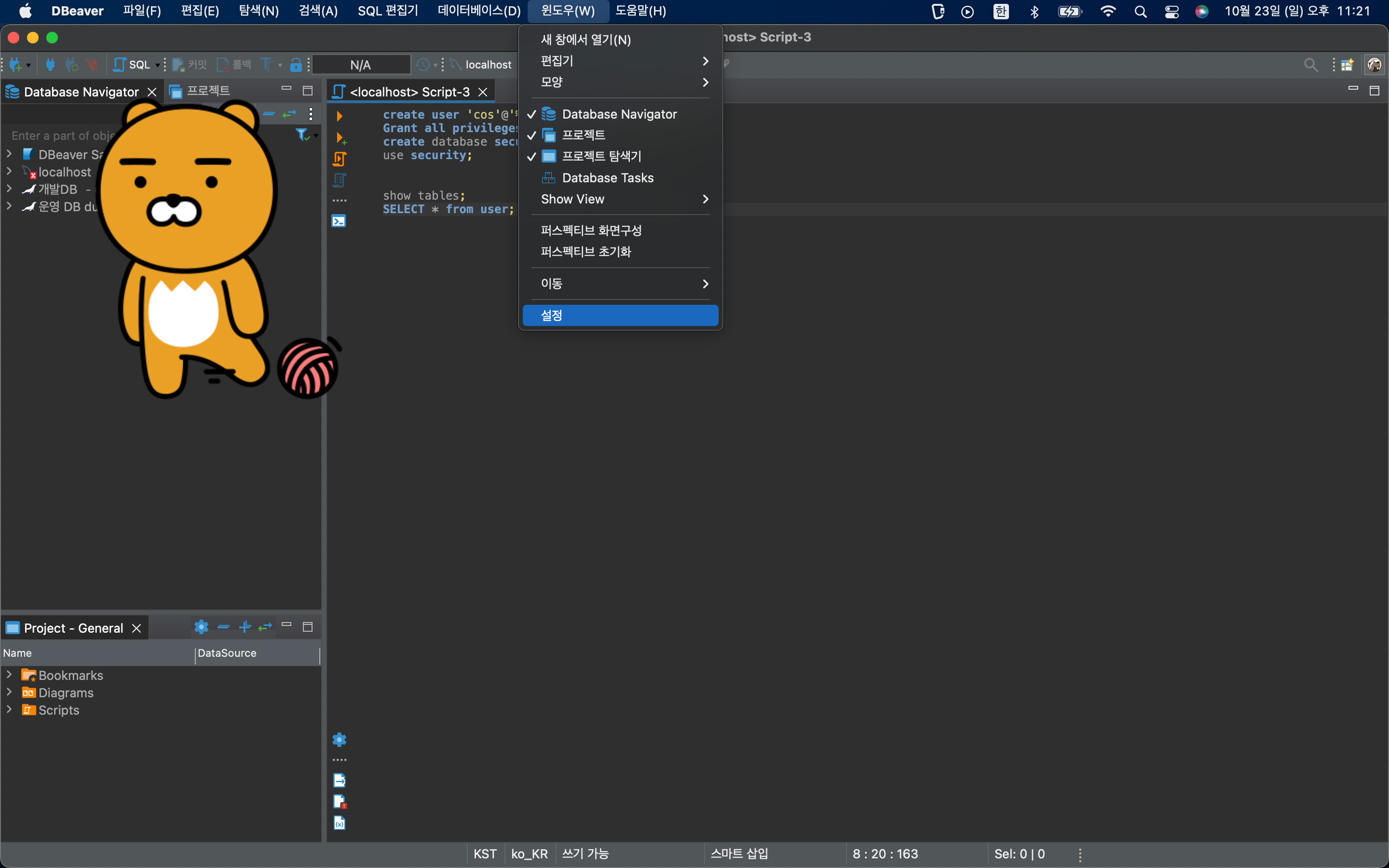 그럼 상위 메뉴에서 [윈도우(w)] - [설정] 을 눌러준다.